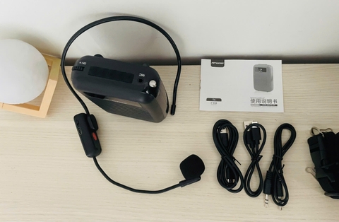Full box bao gồm: 01 Thân máy (loa), 01 Mic không dây đeo đầu, 02 Dây sạc, 01 Dây đai đeo máy và 01 HDSD