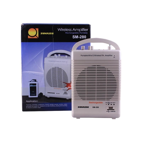 SUNRISE SM-280 là loại loa trợ giảng tích hợp micro không dây và tăng âm. SUNRISE SM 280 rất thuận tiện trong việc hỗ trợ giảng dạy, hướng dẫn du lịch, thuyết trình, thuyết minh, hay trong những cuộc họp mặt trong phạm vi nhỏ. Sản phẩm này đặc biệt phù hợp cho những môi trường cần tăng cường âm lượng.